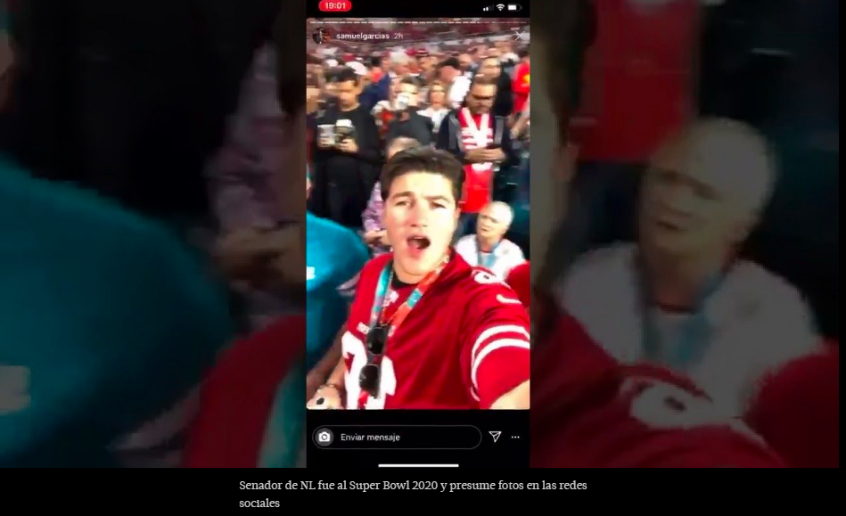 El domingo 02 de febrero de 2020, concluyó el Super Bowl 2020, y como lo prometido es deuda, el senador del Congreso de la Unión por el estado de Nuevo León (NL), Samuel García Sepúlveda, presumió por medio de sus redes sociales que, presenció en vivo y a todo color la esperada final.