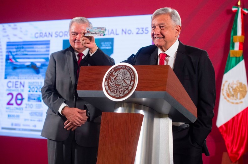 De igual forma, en la conferencia matutina Ernesto Prieto, director de la Lotería Nacional, presentó cuál es el billete del Gran Sorteo Especial 235 del Avión Presidencial, donde explicó que serán 100 premios de 20 millones de pesos cada uno, los cuales serán sorteados el próximo 15 de septiembre a las 16:00 horas en el Salón de Sorteos del edificio principal de la Lotería Nacional.