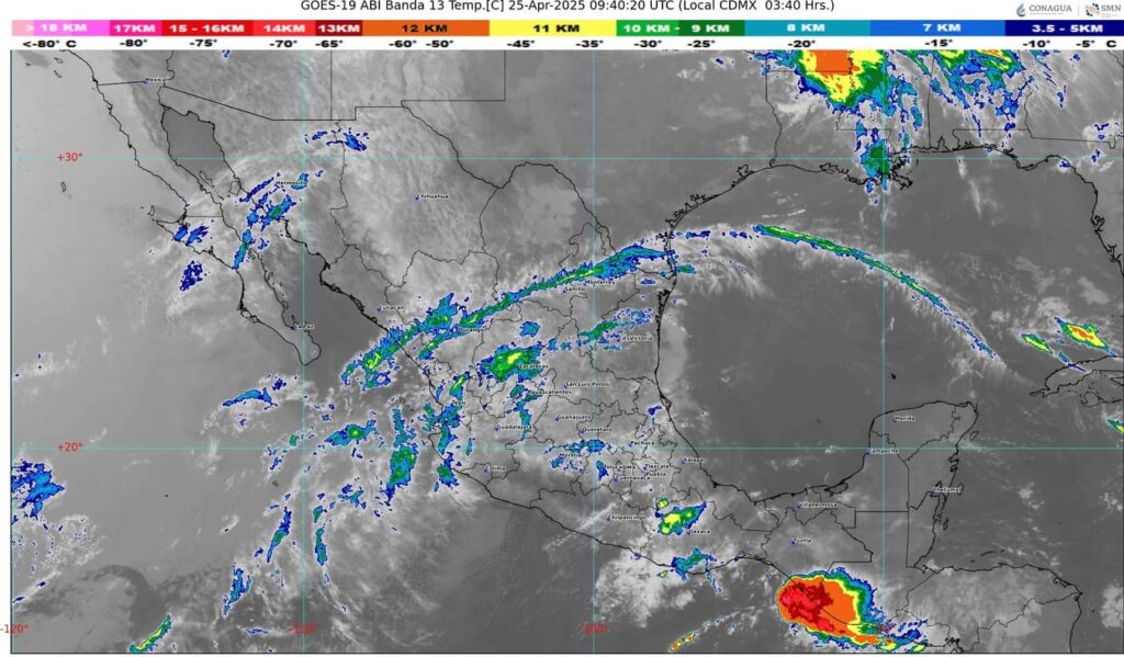 Una circulación anticiclónica en niveles medios de la atmósfera mantendrá el ambiente caluroso a muy caluroso y baja probabilidad de lluvia en la mayor parte del territorio nacional, persistiendo la onda de calor en zonas de Jalisco (norte, suroeste, centro, este, sur y sureste), Colima (este y noreste), Michoacán, Guerrero, Oaxaca (suroeste, centro, sur y este), Chiapas (oeste), Nuevo León (oeste), San Luis Potosí (sur), Morelos, Puebla (suroeste), Ciudad de México y Estado de México (suroeste), extendiéndose hacia los estados de Sinaloa (este) y Durango (oeste).