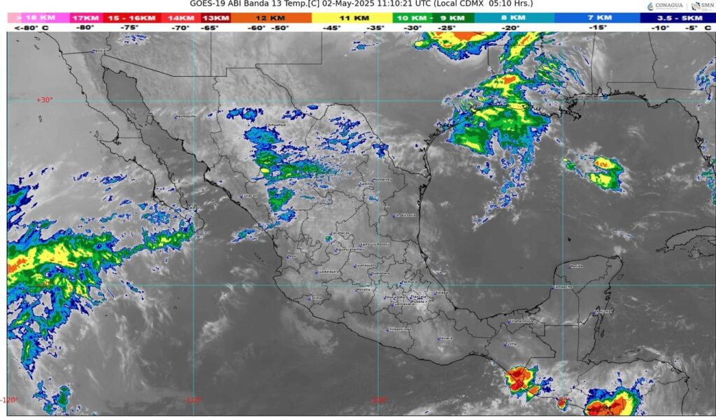 Una circulación anticiclónica en niveles medios de la atmósfera mantendrá ambiente caluroso a muy caluroso en el territorio nacional, prevaleciendo la onda de calor en Jalisco (centro, sur y suroeste), Colima (noreste), Michoacán (oeste, sur, centro y este), Guerrero (noroeste, norte y noreste), Oaxaca (centro y sur), Chiapas (noroeste y sureste) y Morelos.