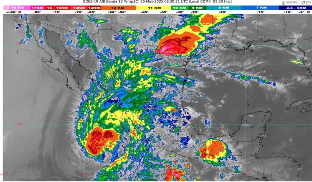Existen condiciones para la formación de trombas marinas frente a las costas de Jalisco y Colima; viento de 20 a 30 km/h con rachas de 40 a 60 km/h en Baja California Sur, Sinaloa y Nayarit; así como oleaje de 3 a 4 metros de altura, aumentando a 5 metros en costas de Jalisco, Colima y Michoacán; oleaje de 2 a 3 metros de altura, aumentando a 4 en costas de Nayarit; y oleaje de 1 a 2 metros de altura, aumentando a 3 metros en las costas de Baja California Sur.