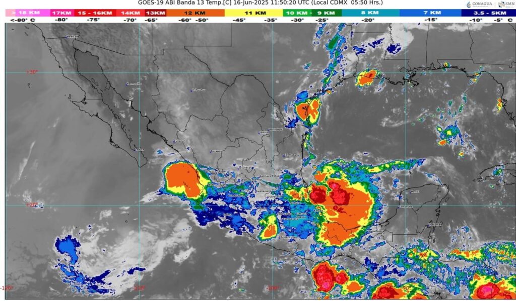 El ingreso de aire húmedo del océano Pacífico producirá lluvias puntuales intensas en Guerrero y Michoacán; puntuales muy fuertes en Colima, Jalisco y Nayarit; puntuales fuertes en Durango y Sinaloa; chubascos en Chihuahua; y lluvias aisladas en zonas de Sonora.