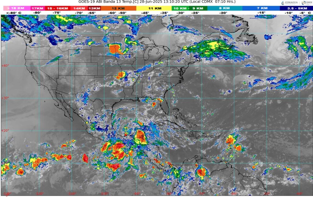 La onda tropical número 7 avanza sobre la Península de Yucatán, lo que incrementa el potencial de lluvias muy fuertes en Campeche y fuertes en Yucatán y Quintana Roo. Además, se esperan precipitaciones de consideración en estados del occidente como Michoacán, Colima y Jalisco.