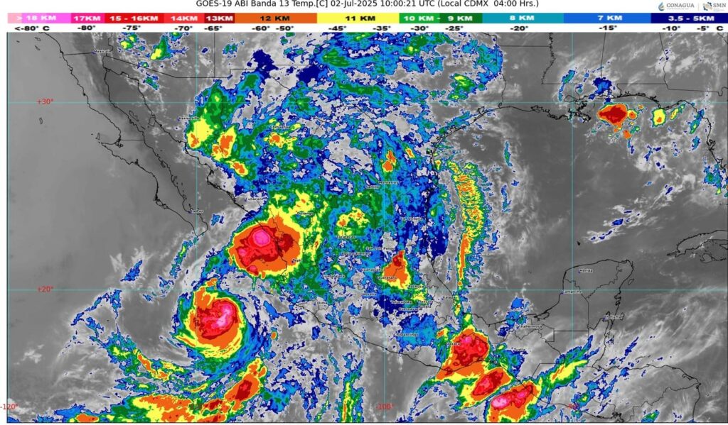 Un canal de baja presión sobre el sureste mexicano, y el ingreso de aire húmedo del Golfo de México y océano Pacífico, originarán lluvias puntuales muy fuertes en Oaxaca, Guerrero, Coahuila y Chihuahua; puntuales fuertes en Chiapas, Michoacán, Veracruz, Puebla, Estado de México, Hidalgo, Querétaro, Guanajuato, San Luis Potosí, Aguascalientes, Zacatecas, Durango, Tamaulipas y Nuevo León; e intervalos de chubascos en Tabasco, Tlaxcala, Morelos y Ciudad de México, acompañadas con descargas eléctricas.