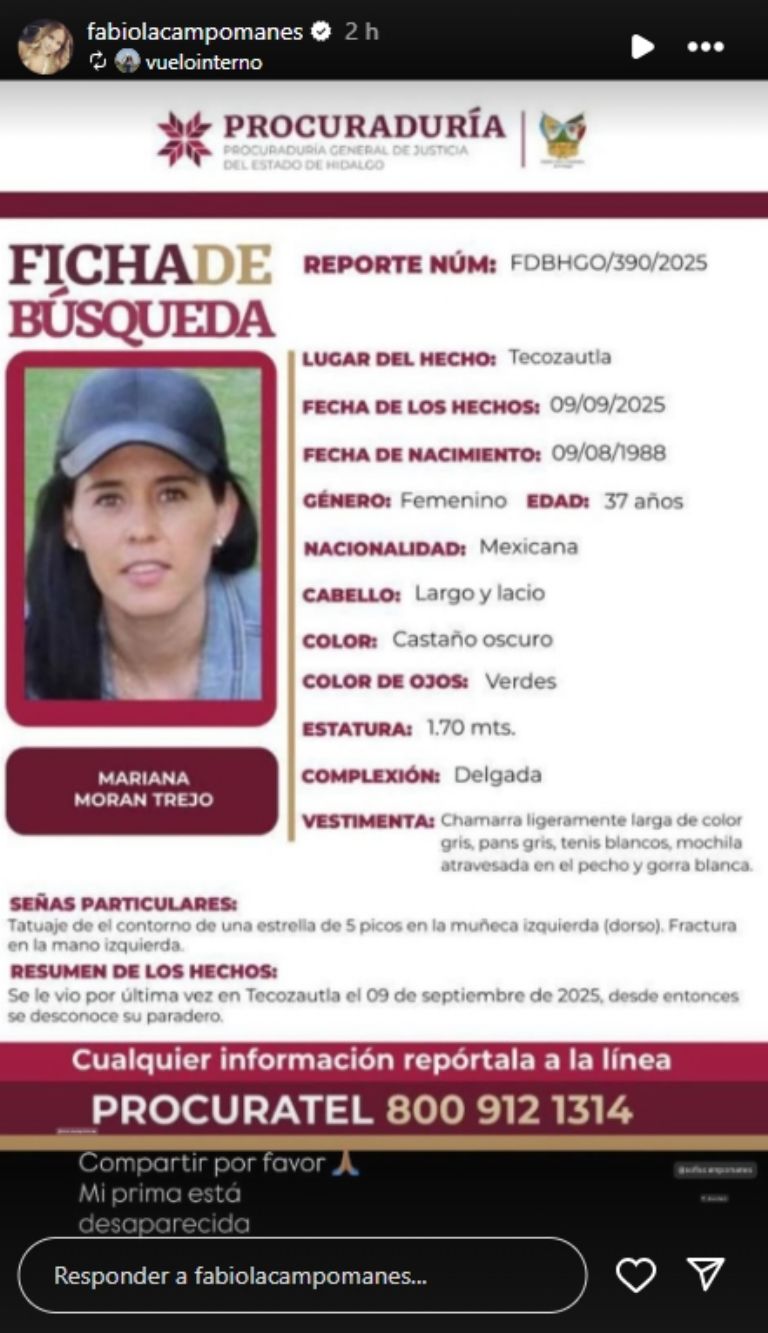 #ESPECTÁCULOS || La mañana de este miércoles 10 de septiembre la actriz y conductora de televisión, Fabiola Campomanes, pidió ayuda a sus seguidores en Instagram para localizar a su prima, Mariana Moran Trejo, quien fue reportada como desaparecida el pasado 9 de septiembre en Tecozautla en el estado de Hidalgo.