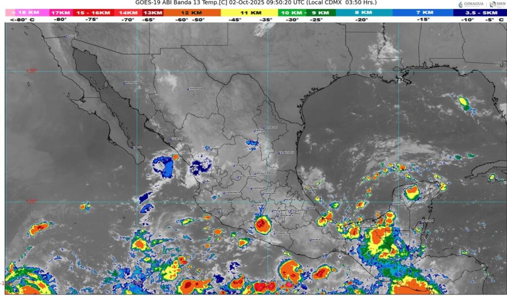 Por otra parte, el aporte de aire húmedo del mar Caribe y golfo de México, generado por un canal de baja presión en el sureste mexicano y una baja presión sobre el suroeste del golfo de México, mantendrán las condiciones para lluvias puntuales intensas en Oaxaca, Chiapas, Tabasco y Veracruz; y puntuales muy fuertes en Quintana Roo, Yucatán y Campeche.
