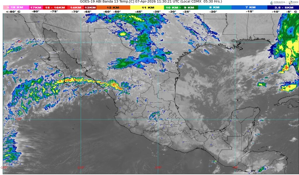 Por otra parte, un canal de baja presión al interior del territorio nacional, en combinación con el ingreso de humedad del océano Pacífico y golfo de México, originará lluvias y chubascos con descargas eléctricas en estados del norte, noreste, oriente, centro, occidente y sur de la República Mexicana.